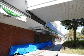 広告塔はよく見ると1つ前のロゴのほかに上弦の月ロゴがうっすら見えます。